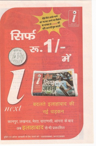 इलाहाबाद से आई-नेक्स्ट (i-next) अपना प्रकाशन शुरू करने जा रहा है। कल यह मार्केट में आयेगा। एक रुपये का नयी पीढ़ी का अखबार जिसमें २४ में से ९ पन्ने इलाहाबाद से सम्पादित होंगे।